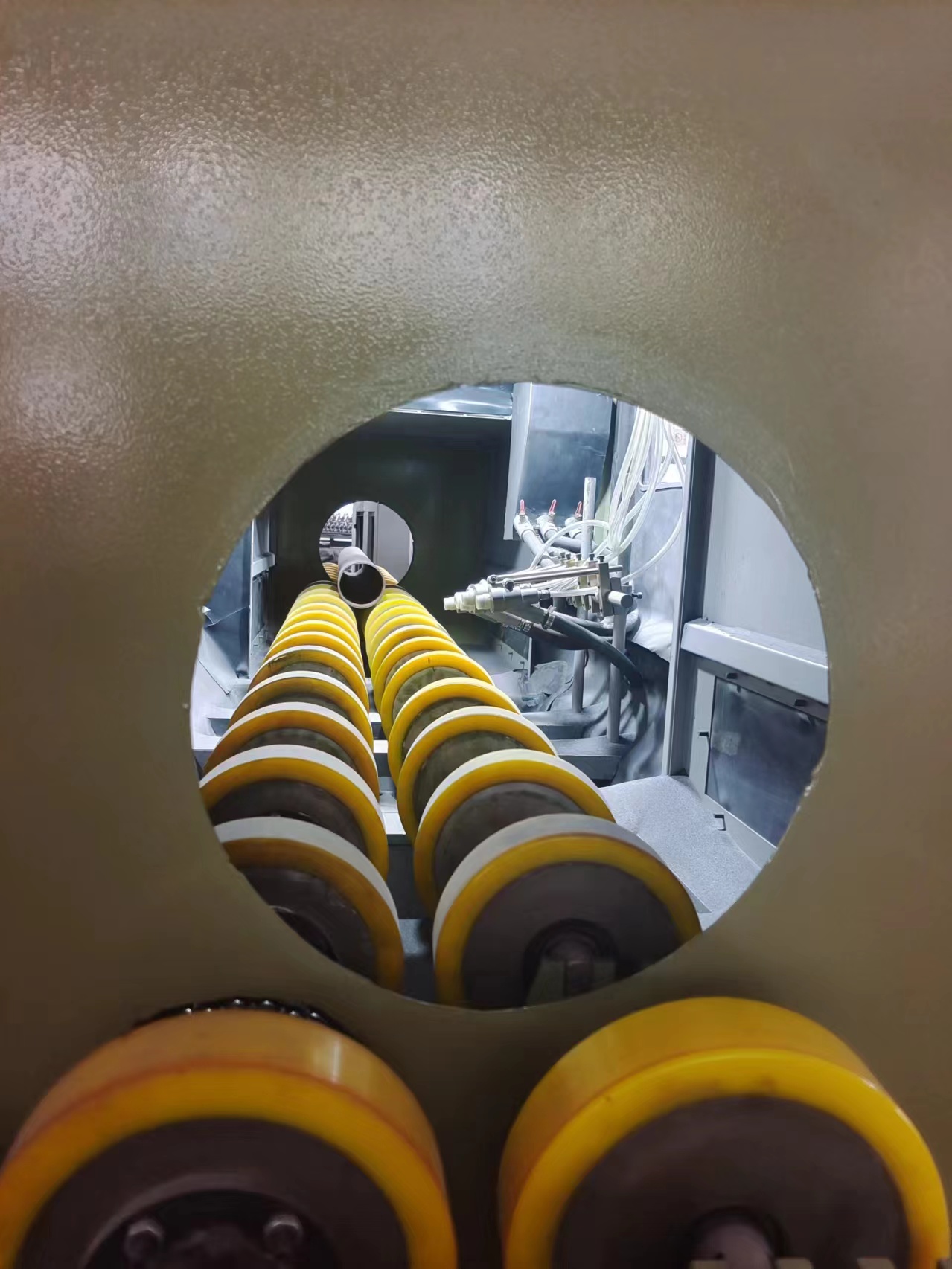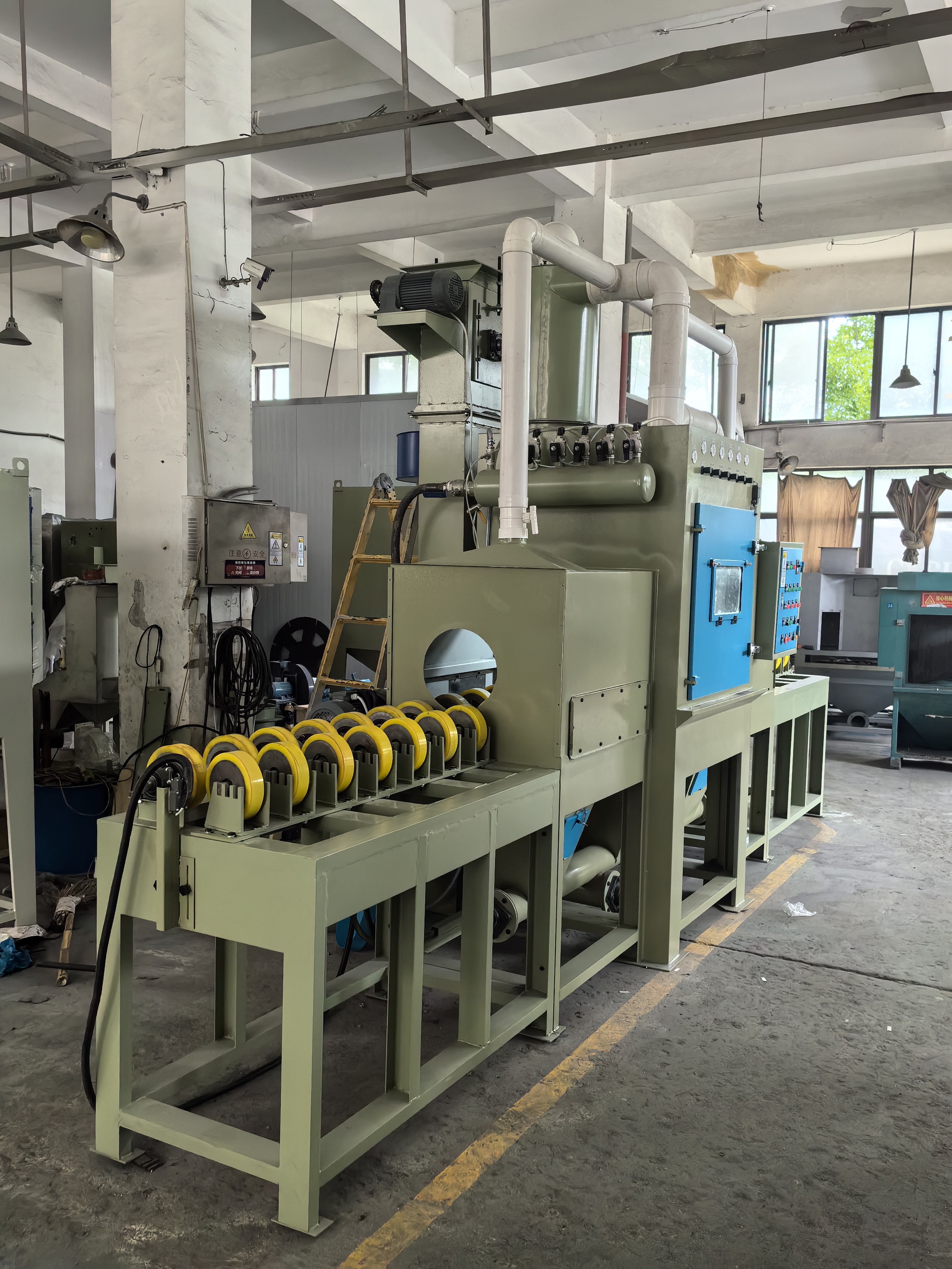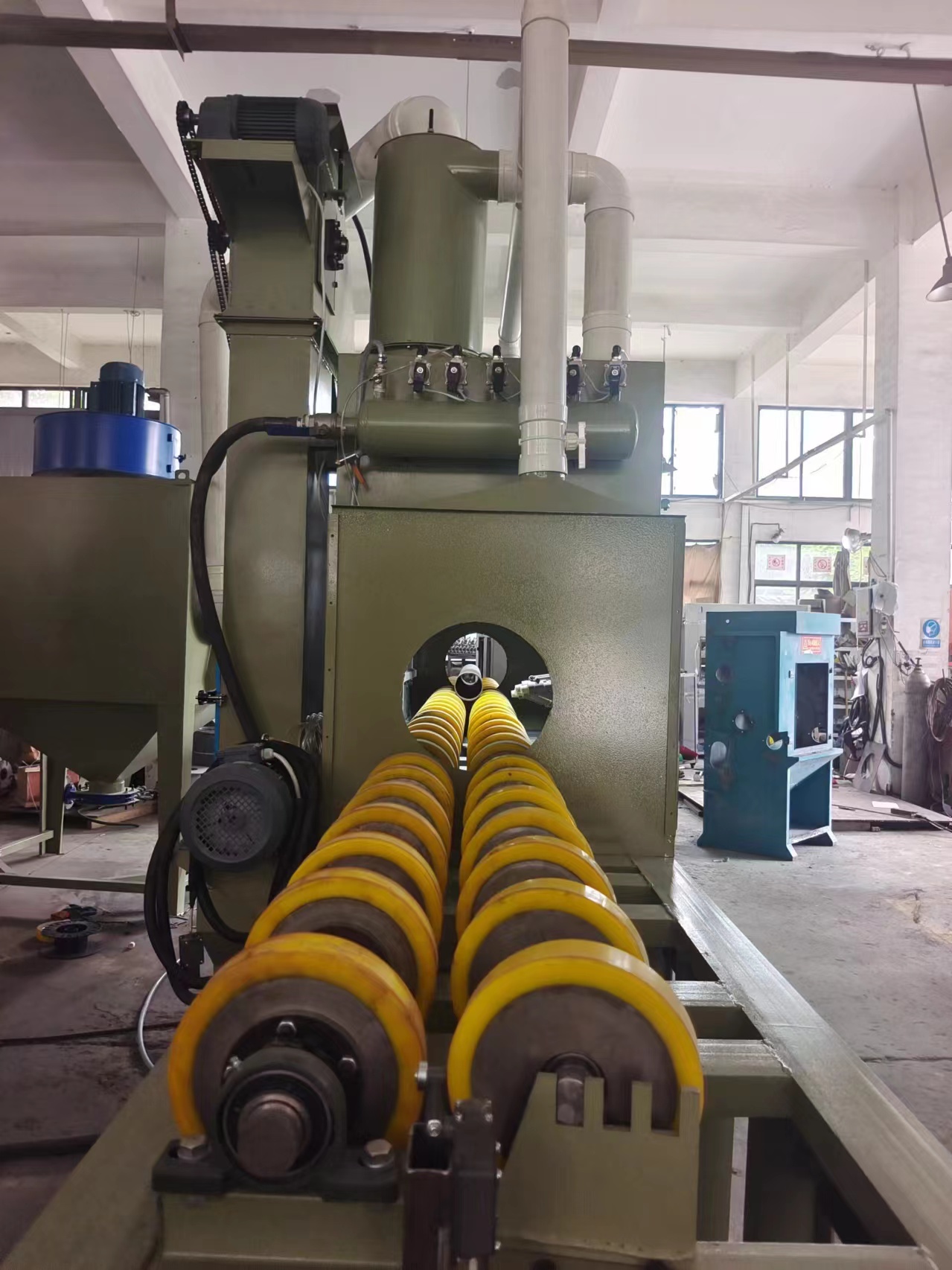 本類機型適用于,管件,輥軸類圓柱形工件的表面處理噴砂工藝。 材質(zhì)不限如:鐵管、